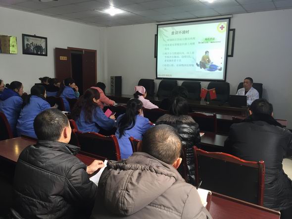 刘溪护士长正在为社会福利院护工讲解急救知识 2016年1月21日,眉山市社会福利院邀请我院陈刚主任和刘溪护士长在社会福利院会议室为护工免费讲解一些基础的急救知识。